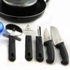 – Includes: 3.25 Qt. Dutch oven + lid, 1.25 Qt saucepan + lid, 8.5 in. frying pan, 13 in. pizza pan, 15 in. cookie sheet, 12 in. slotted spatula, 12 in. serving spoon, 5 measuring cups (1, 1/2, 1/3, 1/4, 1/8), 5 measuring spoons (1, 1/2 tbs. & 1, 1/2, 1/4 tsp.), 7.25 in. forks (4), 7.75 in. knives (4), 7 in. spoons (4), 5 in. chef’s knife, 3.5 in. paring knife, pizza cutter, peeler, opener, 10 in. cutting board, ten 16 oz. containers + lids, 10 in. mixing bowl, 10 in. colander, 14 ice cubes trays (2), scoop spoon, wood spoon, magnetic clips (4), salt and pepper shakers