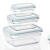 Safe to use in the oven, microwave, refrigerator, freezer and dishwasher.Easy latching clear lids.Odor and stain proof.Airtight and liquid tight. BPA and hormone free.Made of silica, soda ash, limestone and other natural components.Eco-friendly and recyclable.