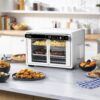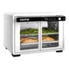 Cook for the whole family or a large crowd with the Gourmia Extra-Large 9-Slice French Door Digital Air Fryer Oven. The oven can fit a 13 pizza, 9 slices of bread, or a whole chicken and features 6 rack positions to cook many foods evenly on multiple levels. 12 Cooking Functions let you cook various dishes with a simple tap while patented FryForce 360° Technology circulates heated air evenly for crispy perfection. Use convection mode with bake, roast & more for quick and even results. Set precise settings quickly and easily with the intuitive controls and view temperature and time simultaneously on the large display. Ultra-convenient single-pull French doors both open with the pull of one handle for absolute ease of use.