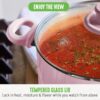 – Durable glass lids for a good look at any meal in progress without sacrificing heat.