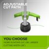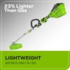The Greenworks 60V 16″ String Trimmer with 4.0 Ah Battery & 3 Amp Charger is a powerful and intelligent trimmer that offers exceptional performance. It is part of a comprehensive range of residential outdoor power equipment. With a top speed of 6,000 RPM, it delivers more power than other gas trimmers. The advanced load sense technology ensures that the trimmer never bogs down and senses when more power is required for a perfect cut every time. It features a compact top mount brushless motor, allowing for the use of different universal attachments for various lawn applications. The trimmer can run for up to 40 minutes on a single 4Ah battery and offers continuous runtime with interchangeable batteries. The included 3 Amp charger can recharge the 4Ah battery in 70 minutes or less. The Greenworks brushless motor makes the trimmer quieter than gas trimmers, reducing noise pollution. It is also lightweight, weighing only 9.15lbs, and has low vibration, reducing fatigue during prolonged trimming sessions. With a Load-N-Go trimmer head that holds up to 18FT of 0.095″ spool, loading line becomes quick and easy. By choosing the Greenworks 60V trimmer over gas trimmers, you can save over $400 in a five-year span. There is no need to buy gasoline, oil, filters, spark plugs, or fuel lines, eliminating the need for engine maintenance and downtime. Additionally, it is environmentally friendly, with no fumes or emissions. Overall, the Greenworks 60V 16″ String Trimmer offers outstanding performance and efficiency, allowing you to work smarter and save time, money, and energy.