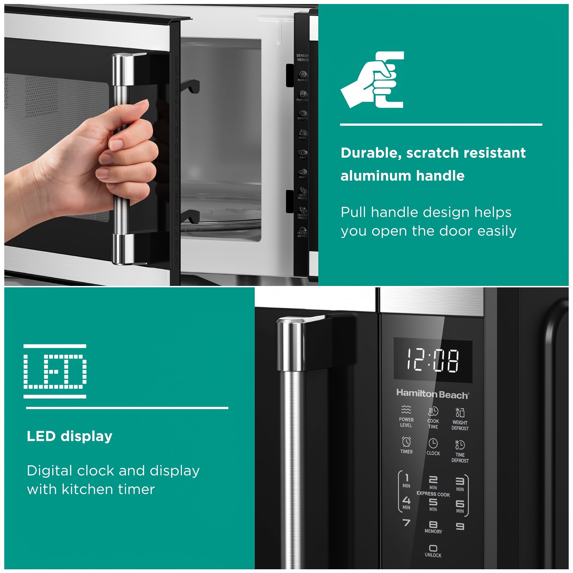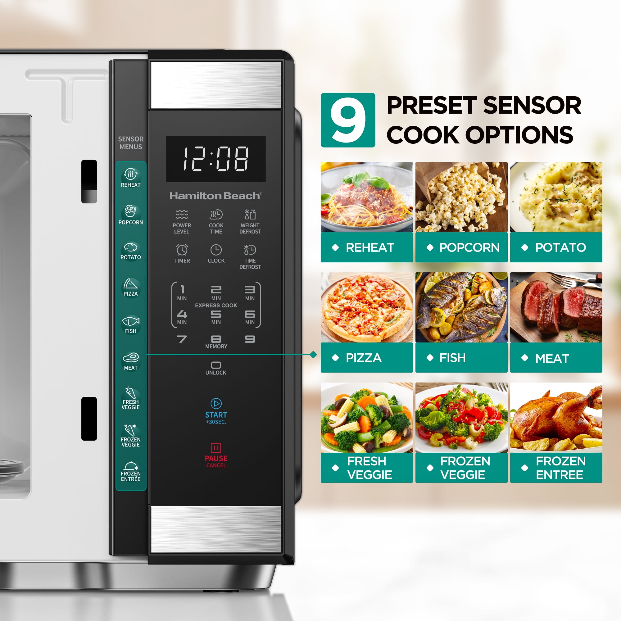 • Convenience Cooking Presets – One-touch buttons for Popcorn, Potato, Pizza, Frozen Vegetables, Beverage, and Dinner Plate.