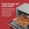 – SAVES ENERGY & COOKS FASTER: This compact toaster oven uses up to 75% less energy and is 28% faster than a typical kitchen oven when reheating precooked frozen chicken nuggets.