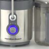 Enjoying fresh, healthy juice has never been easier. With its extra-large 3 inch chute, 850 watt motor and dual speeds, the Hamilton Beach Big Mouth Easy Clean Juice Extractor quickly transforms whole fruits and vegetables into smooth, nutritious juice in seconds. The powerful dual-speed motor ensures maximum juice yield from hard and soft produce without clogging. High speed is great for apples, carrots and beets, and the low speed works well for leafy greens, grapes and tomatoes. The 3 inch Big Mouth chute lets you easily add whole foods to save time and effort in the kitchen. Fit whole apples, peeled oranges, or handfuls of kale. The juicer’s drip-free spout flips up to prevent drips in between batches for less mess. The large 40 oz. BPA-free pitcher with lid and froth separator keeps juice neatly contained and strains off the foaming froth when pouring juice. The juicer is easy to clean with a patented Easy Sweep Cleaning Tool that sweeps away pulp to cut strainer cleaning time in half. The pulp bin, juice bowl, lid and pusher are all dishwasher safe.