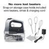 – The snap-on storage case holds the 2 wire beaters, whisk and charging cord, reducing the chance they’ll get lost or misplaced. For easy cleanup after mixing, all 3 attachments are dishwasher safe.