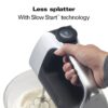 – Prevent clouds of flour or splatters of batter by starting slow. This cordless hand mixer’s starting speed is nearly half as slow as a traditional mixer, so you’ll have less mess and more control.