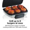 – LARGE NONSTICK SURFACE FITS 6 BURGERS. Grill 6 hamburgers at once with 90 sq. in. of nonstick, cooking surface and 1200 watts of power. The floating hinge accommodates thicker foods like large steaks and boneless pork chops.