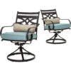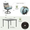Manufacturers, suppliers and others provide what you see here, and we have not verified it. See our disclaimer Spend more time outdoors with the Montclair 5-piece patio dining set from Hanover. This space-friendly dining set includes four cushioned swivel rockers and a 40-inch square dining table. The sleek, modern frames are forged out of heavy-duty steel and treated with a multi-step finish for the ultimate outdoor protection. Items within the Montclair Collection are designed to be durable, functional, and timeless. Designer details include curved backrests, elegant curling arms, and swivel-action chair bases that can sweep guests off their feet into a full 360-degree spin. Each chair is topped with thick foam cushions and pillows that allow you to entertain your guests in fashionable comfort. The fabric is soft to the touch, yet durable enough to resist moisture, stains, and UV harm. Entertain in style and comfort all year long with the Montclair Collection.