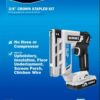 Free yourself from bulky hoses and noisy compressors with HART s 20V 3/8 Crown Stapler. Its design provides superior hold over nails in some cases. It also means it s faster to set up and easier to maneuver. Typically when people think of crown staplers, they think of crafting, but this tool can be used for many other applications, including upholstery, insulation, floor underlayment, screen porch, chicken wire and more. Ultimately, the possibilities are endless. This crown stapler weighs 3.0 lbs. and shoots up to 2,100 staples per charge. It accepts 1/4 -9/16 long 3/8″ crown staples and its magazine holds up to 85 staples. The standard style trigger operates smoothly with a squeeze of the handle thus eliminating user fatigue. In addition, the integrated knob controls the quick depth of drive adjustments though various materials. It also has an onboard dual screen/wire attachment that guides staples without penetrating wire or screen as well as a belt clip that mounts to the right or left for added convenience. Includes: 3/8 Crown Stapler, 20V 1.5Ah Battery, Fast Charger, belt clip, (84) sample crown staples, dual screen/wire attachment and operator s manual.