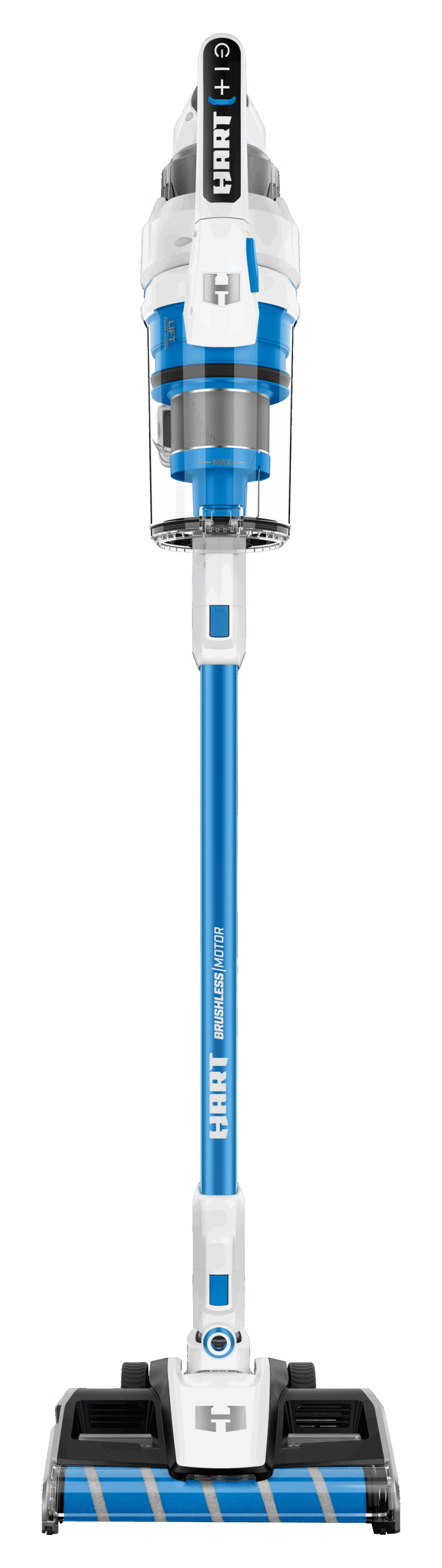 HART 20- Volt Vertical Bin Dual Brush Roll Stick Vacuum with Brushless Motor Technology for all Floor Types with (1) 4.0Ah Lithium-ion Battery included. The plush microfiber brush roll tackles large debris and fine dust whereas the rear bristle brush roll lifts embedded messes. Still offering 45 min. of runtime, this cordless stick vacuum has the power to clean carpets, area rugs, and hard floor surfaces in up to 16 rooms with the included HART 20V 4.0Ah Lithium-Ion Battery. Clean the messes in your car, on your stairs, or other above-floor surfaces by easily converting into a hand vacuum with the included crevice, dust brush, and micro crevice tool accessories. The wider floor head design makes cleaning quicker and easier while sucking up larger debris, like dry cereal messes. The floor head includes integrated LED lights that help you see what you might otherwise miss, and aggressive nylon bristles with antimicrobial protection that lift embedded dirt. The tool-free roller bar release offers effortless maintenance for hair removal. Vacuuming on delicate area rugs? The unit starts in middle-suction mode which is great for everyday messes. Press +/- buttons to increase or decrease suction power. In addition to a large, easy-to-empty, easy-to-remove dust cup, the washable filter traps over 99.9% of dust and allergen matter. Keep your vacuum and accessories clutter-free with the included wall mount and battery dock that also provides a space to conveniently charge the battery after use. This vacuum also has a free-standing design allowing the vacuum to lock in place upright.