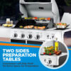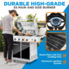 – BUILT TO LAST: The stainless steel and powder coated surfaces, as well as the side shelves, ensure that this grill will last even under the harshest situations. For long-term durability, the four primary burners are composed of stainless steel tubing