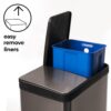 This unique design caters to your specific task. Whether it’s throwing away waste, or disposing of recyclables, each type has its own dedicated pedal and lid to make those tasks easier. Separating waste and recycling shouldn’t be a burden. You should be able to easily dispose of both in one central location in the kitchen. With a dual compartment stainless steel trash can, you have a hassle-free 2 in 1 solution. Each liner will hold up to 7.8 gallons for a total of 15.8 gallons, or 60 liters. If you need to keep the lid(s) open for multiple usages, simply tap the lid back once opened to keep it from shutting down. Otherwise, the lid(s) will silently and slowly shut back down thanks to the ergonomically designed hinge mechanism.