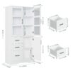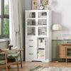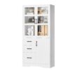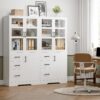 Featuring 5 shelves and 3 drawers, this white bookcase has plenty of storage space to keep your space neat and stylish. 2 of the doors are made of toughened glass for sturdiness, clarity and dust resistance, allowing you to better display your collectibles, books and decorative items. In addition, the tall bookshelf comes with 3 large 13.5″ high compartments for storing taller folders and other items. The shelves of the bookcase with glass doors are non-adjustable to provide better weight-bearing capacity so you can place heavy items without worry.
