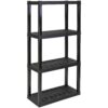 Maximize your storage space with this Shelf Plastic Garage Shelves versatile 4 tier shelving unit, proudly manufactured in North America. Adding shelving is one of the simplest ways to organize even the most limited spaces, protect your items from damp floors, and more. This lightweight unit snaps together with no tools required so you can get started on your home organization project right away. Heavy-duty molded plastic resin shelves hold 150 lbs (68 kg) each and will not rust, dent, stain, or peel. Ventilation holes allow air to flow and control moisture, keeping your items clean and dry. Nested legs and anchor holes offer added support, and the interlocking design lets you easily and securely link together multiple units. Whether you are decluttering your basement, organizing your craft room, or spring cleaning your garage, Hyper Tough has the perfect shelving solution for you.
