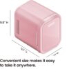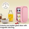 – TAKE IT ON THE GO: Compatible with both standard home outlets and 12V car chargers. This portable fridge is your reliable companion for road trips, camping, or office use. ELEGANT DESIGN AESTHETIC: Featuring a sleek pink finish complemented by a durable glass door, this mini fridge is not just an appliance but a stylish addition to any room.
