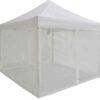 Instant Canopy 10×10 Canopy with White Mesh SidewallsThis convenient beach shelter/gazebo is perfect for your backyard, sun/shade at the beach, ball games, tailgating or sitting outside enjoying the beautiful evening free of bugs with the included mesh screen walls. Features: Unique push-button height adjustmentMesh sidewalls feature Velcro for easy attachmentThe top is made from 210 weight denier fire retardant and water-resistant fabricIncludes canopy frame, roller bag, sidewalls and full spike and rope kitRecreational grade steel frame Please Note: This canopy is NOT to be left unattended as it is considered a temporary shelter! If there is inclement weather, you should take your canopy down immediately. Any rain and winds over 10-15 MPH will damage your canopy. Water that collects on the canopy top will also destroy the structure of your canopy. We advise you to never leave your canopy up overnight and unattended under inclement weather conditions. We will not be held responsible for ANY weather damages. It is to the customer s best judgment in determining the best weather conditions for your canopy.