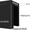 – Kit includes frame, flat top, (3) solid sidewalls, (1) Sidewall with roll up door, roller bag, rope & stake kit