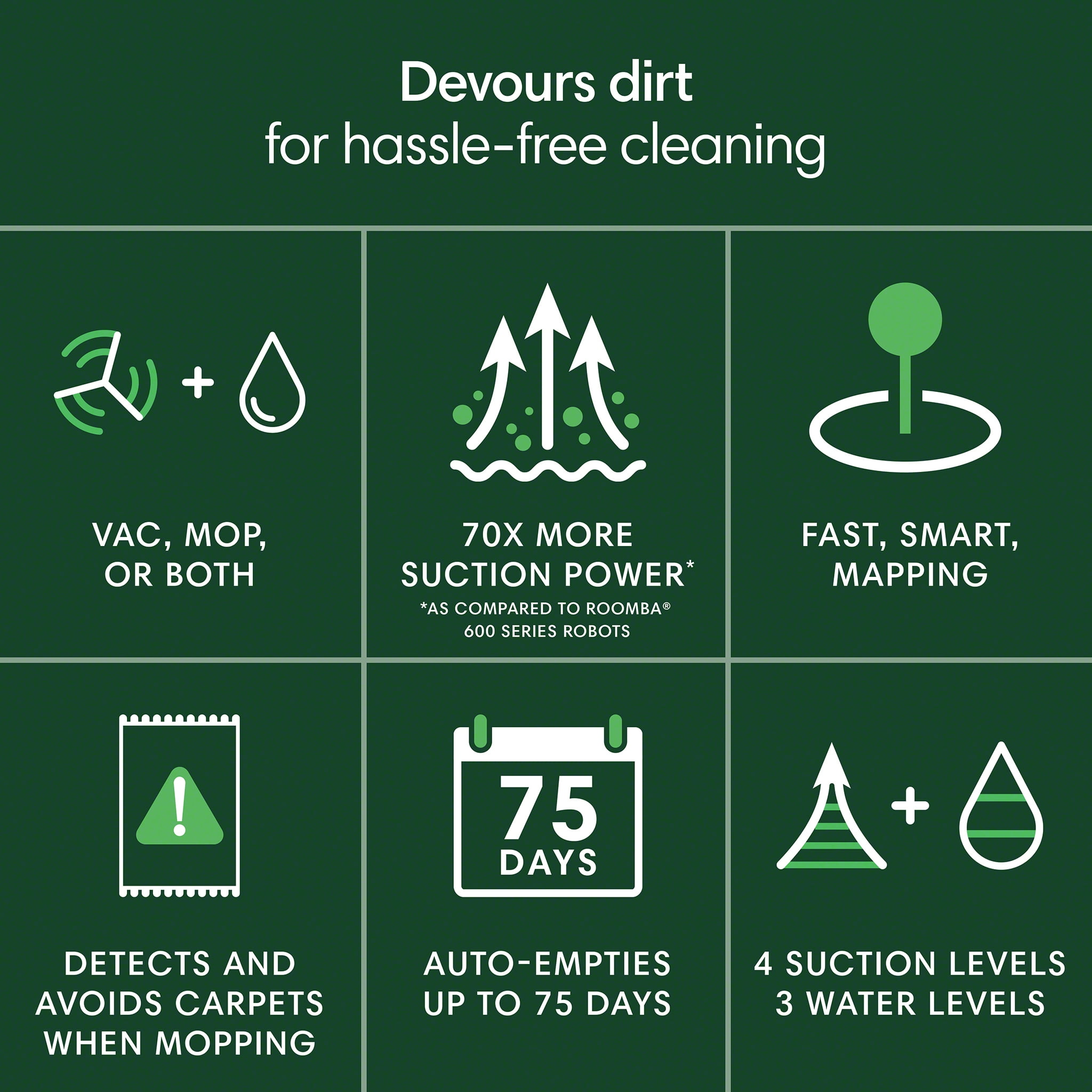 - DEVOURS DIRT WITH 70X MORE POWER-LIFTING SUCTION.* Find, reach and eliminate messes with the combined power of 70X more suction*, multi-surface brush, 20% better edge and corner cleaning with an edge-sweeping brush, to devour dirt and dust bunnies, plus a microfiber mop pad to leave floors shiny and clean. *As compared to Roomba® 600 series robots