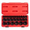 This 12-piece fractional impact set is manufactured from heat-treated chrome-moly steel for wear in professional, rugged environments. Set includes deep sockets sized from 1/2 in.-1-1/4 in. All are 6-point 1/2 in. drive, thin wall. Laser engraved for quick identification. Carded on socket rail.