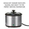 - Includes “dipper” warmer that heats dips, sauce, and gravy and goes straight from kitchen to table