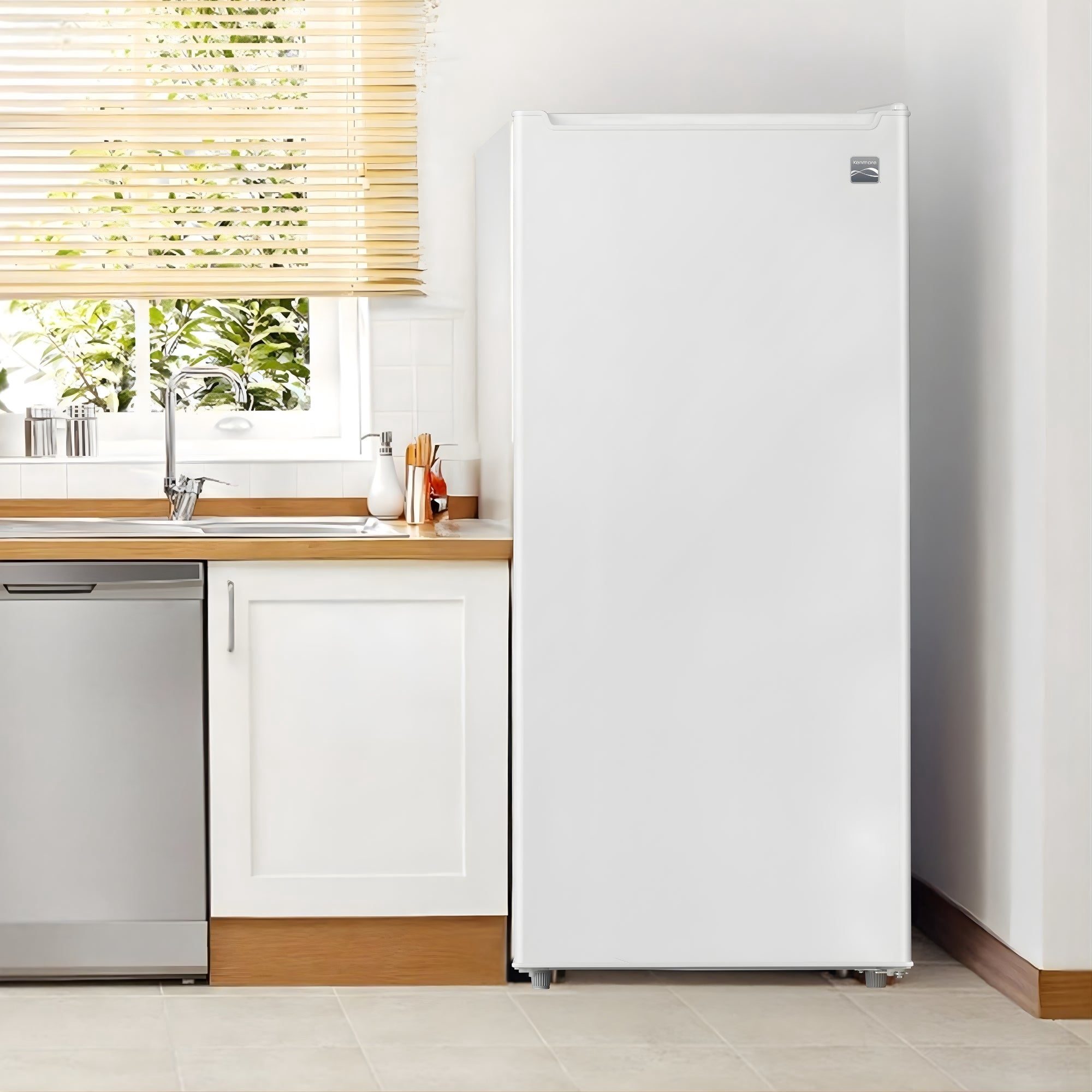 The Kenmore 6.0 cu. ft. Upright Freezer provides convenient frozen food storage in a compact, space-saving design. Its upright layout helps keep frozen items organized and easy to access without taking up excess floor space. Designed with garage ready performance, this freezer operates reliably in a wide range of temperatures, making it ideal for garages, basements, or utility rooms. Inside, five fixed wire shelves offer structured storage, while the adjustable thermostat allows customized temperature control. A reversible door and adjustable legs make placement simple in a variety of spaces. Finished in classic white, this upright freezer delivers dependable performance for everyday storage needs..