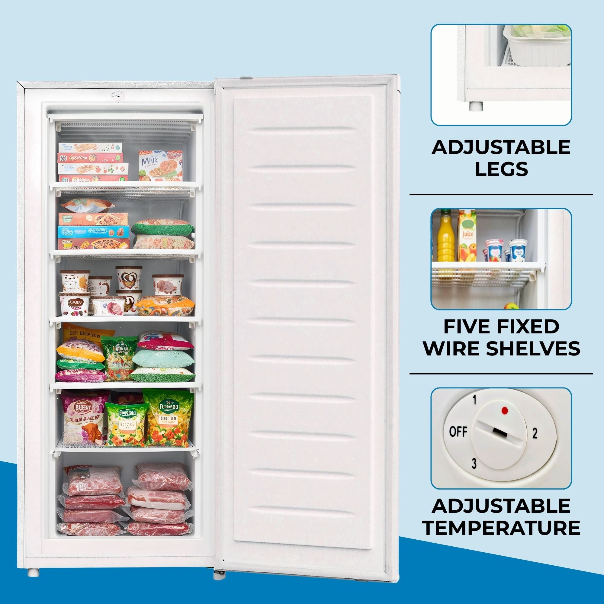 - Upright design keeps frozen foods visible and easy to access