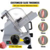 The food slicer machine is made of cast aluminum, and the 12-inch diameter blade is built with 45 # carbon steel. The sharp edge of the blade allows quick meat slicing. The groove cutting surface effectively keeps the meat from remaining on the blade.