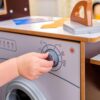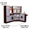 Give your kids the ultimate cooking and laundry combo play set with KidKraft’s Elegant Espresso Corner Play Kitchen. The angled design makes it ideal for placing in a corner to cover two walls, making it fit better in most rooms. From the stove to the sink and the laundry area, there’s plenty of room for multiple kids to play. Made of long-lasting, durable wood and in an attractive brown hue, this play kitchen will be a favorite for both boys and girls. Place a cup in the ice maker and press the buttons to hear three sounds and watch ice cubes dispense. Likewise, the two stovetop burners light up and make sizzling sounds. All knobs make a clicking sound when turned, adding to the realism. Handles on the microwave, oven, refrigerator and freezer give kids lots of places to pretend prep and cook. A sink in the middle is enhanced with a tile-like graphic backsplash and boasts two open shelves for storage. Lastly, a washer is ready to clean up all laundry. Practice with the included “clothes” and detergent bottle. An extended shelf doubles as an ironing board, complete with iron. All accessories included are in neutral, coordinating colors. Set up this wooden play kitchen in any room of your home to keep kids playing for hours.