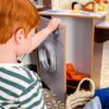– 19 accessories including dishes, iron, laundry detergent and pretend clothes