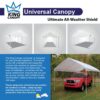 King Canopy Universal 12ft 3in x 20ft Canopy. This economical 8 leg Canopy offers quick, portable shade and protection from inclement weather. Great to pack up and take camping, hunting, or hosting a gathering. The Universal Canopy features a 1 3/8-inch Powder Coated Steel Frame, and 180 GSM Patented Drawstring Cover white. Easy Assembly. No Tools Required.