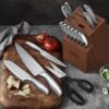 16 PIECE ALL-IN-ONE KNIFE SET – Comes with 8″ chef knife, 8″ bread knife, 8″ slicing knife, 7.7″ sharpen steel, 7″ santoku knife, 5″ utility knife, 3.5″ paring knife, 3.5″ paring knife, multi-purpose shears, 6pcs 4.5″ serrated steak knives set, wood block with non-slip bottom.