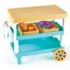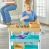 – With rolling wheels, a kid-sized handle, and two built-in storage shelves, this play kitchen cart is ready to store all kinds of play food for kids kitchens