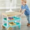 – Kids can prep all kinds of imaginary feasts with this 3-level kitchen island cart with “butcher block style counter