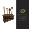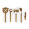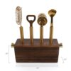 – Acacia wood block, stainless steel bottle opener, stainless steel spoon, stainless steel strainer, waiter-style corkscrew, stainless steel jigger (1.2oz/.85oz)