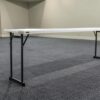 - Features a 96 in. x 18 in. molded tabletop (white granite) with a round folding frame (gray)