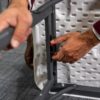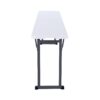 – Features a 96 in. x 18 in. molded tabletop (white granite) with a round folding frame (gray).