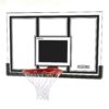 – Backboard – The Shatterproof Fusion Backboard integrates a shatterproof polycarbonate playing surface with an unbreakable polyethylene frame for a durable, pro-glass look. Graphics are screen-printed with UV-protected inks for superior color and protection against the elements.