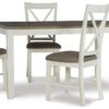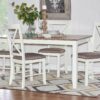 Gather around this handsome five-piece dining set featuring a timeless four post table and four matching chairs. Comfortably accommodates four adults. Constructed from rubberwood with an ash wood veneer in a rustic taupe and vanilla white finish, the table offers a natural warmth complemented by the crisp chair upholstery. Neutral hues suit any color scheme while the padded upholstery ensures premium comfort. By balancing durability with style, this set offers long-lasting beauty for years to come.