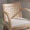 – The beechwood frame in a natural finish features a woven backrest and bowed arms that extend into a dramatic posture
