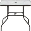 – Includes 4 foldable, portable, easy-to-store armchairs, a square table with a water-wave, tempered glass top, and a stylish market umbrella