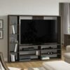 The Mainstays Entertainment Center for TVs up to 55″ provides optimal storage and display solutions for your home theater. A large open shelf is designed to accommodate TVs up to 55″ and 135 pounds. It features six lower shelves where you could store accessories, DVDs, gaming consoles, and more. It also features five larger shelves that can be arranged on either the right or left side of the center to fit your needs. These large shelves provide a great space for storing larger items or placing books, vases, or other accessories and mementos. You can even add in your favorite Mainstays collapsible fabric storage cubes (sold separately). Three available finishes allow you to pick the Media center that will fit best with your existing decor. With sturdy construction and a supportive back panel, you can feel confident that your entertainment wall is built to last for years to come. Enhance your living room with the Mainstays Entertainment Center for TVs up to 55″.