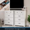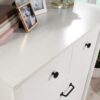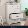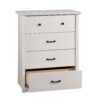 With the classic comfort of transitional style, this 4-drawer chest from the Mainstays Harrington collection combines the simple lines of modern architecture with the provincial flair of decorative trim at the top and base. This traditional framed dresser has four spacious drawers that feature metal runners and safety stops for smooth and reliable access to all the necessary wardrobe items. The top drawer of this bedroom dresser features a built-in drawer divider for a true standard of organization, and round, contrasting drawer pulls to inspire visual interest. In addition to versatile design, this bedroom chest of drawers delivers a high standard of safety. With an interlocking safety mechanism that allows only one drawer to open at a time, this 4-drawer dresser is designed to safeguard against accidental tipping and is suitable for various age groups. With an elegant White Grain finish and black contrasting hardware, this dresser will give you the look you desire.