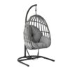 Create an outdoor retreat with the Mainstays Wicker Outdoor Patio Hanging Egg Chair with Gray Olefin Cushion and black metal stand. This stylishly woven egg chair comes with the stand and heavy-duty chain for a swinging seat, allowing you to gently sway as you sit. The cushion is made with a fade-resistant olefin fabric and filled with a plush polyester fiberfill while the basket chair and frame are powder-coated to make it a rust-resistant outdoor chair. The Mainstays Outdoor Patio Hanging Egg Chair with Cushion and Stand can be taken down and then put back up in a matter of minutes, so it can be easily stored in the off-season and brought back out for the warmer months.Chair provides a relaxing seat for one person Maximum Weight 250 lbs.