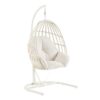 Create an outdoor retreat with the Mainstays Wicker Outdoor Patio Hanging Egg Chair with Cushion and Metal Stand, White, This stylishly woven egg chair comes with the stand and heavy-duty chain for a swinging seat, allowing you to gently sway as you sit. The cushion is made with a fade-resistant olefin fabric and filled with a plush polyester fiberfill while the basket chair and frame are powder-coated to make it a rust-resistant outdoor chair. The Mainstays Outdoor Patio Hanging Egg Chair with Cushion and Stand can be taken down and then put back up in a matter of minutes, so it can be easily stored in the off-season and brought back out for the warmer months.Chair provides a relaxing seat for one person Maximum Weight 250 lbs.