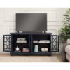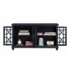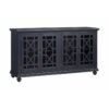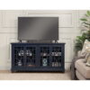 Wooden TV Stand With Trellis Detailed Doors, Blue- Saltoro Sherpi This TV stand will take your entertainment to another level and lead your setting in a rousing style. Constructed with MDF and pine, the Catalina blue finished stand displays elegant trellis details on the doors along with bun feet and intricate door pulls to enhance the look. It is ideal for 65 inch flat panel TV?s