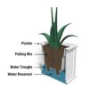– Weight: 14lbs; Outside Dimensions: 20in L x 20in W x 20in H; Inside Dimensions: 15in L x 15in W x 13in D; Footprint: 20in x 20in; Capacity: Approximately is 8.75 gallons (33 liters) water reservoir and 10.7 gallons (40.5 liters) soil capacity
