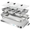 – Three serving trays with clear lids, one baking pan and one heating base, User manual
