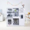 – Easy to assemble white marble-colored wooden modern play kitchen–roomy enough for multiple kids to play at once