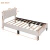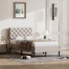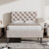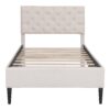 This beautiful Upholstered Platform Bed features button tufted upholstered headboard that adds a contemporary chic look to your bedroom and filled in thick foam to add extra comfort.Sturdy wood frame construction and a wooden slat system to add extra stability and safety. You don’t need to buy the box spring because this twin bed equipped with 10 slats.- Upholstered in foam-filled polyester for an inviting feel, the included headboard boasts button-tufted detailing that adds a touch of visual texture. It gives any room a spark of style that’s both modern and timeless.