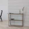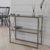Display your treasured keepsakes, family photos, and your favorite decorative items on this modern console table. The gold matte crisscross frame pairs beautifully with the clear glass shelving for an upmarket look that will blend in any living space.
